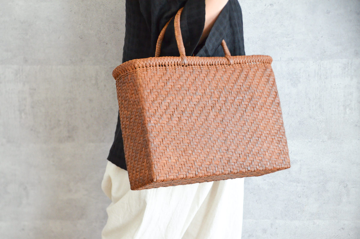 そのため、世代をこえるほど長いあいだにわたって使いつづけることができ、また使うたびにかごに触れることでその手の脂によって艶が増し、レザーのように樹皮表面の風合いが変わっていくのも魅力のひとつです。