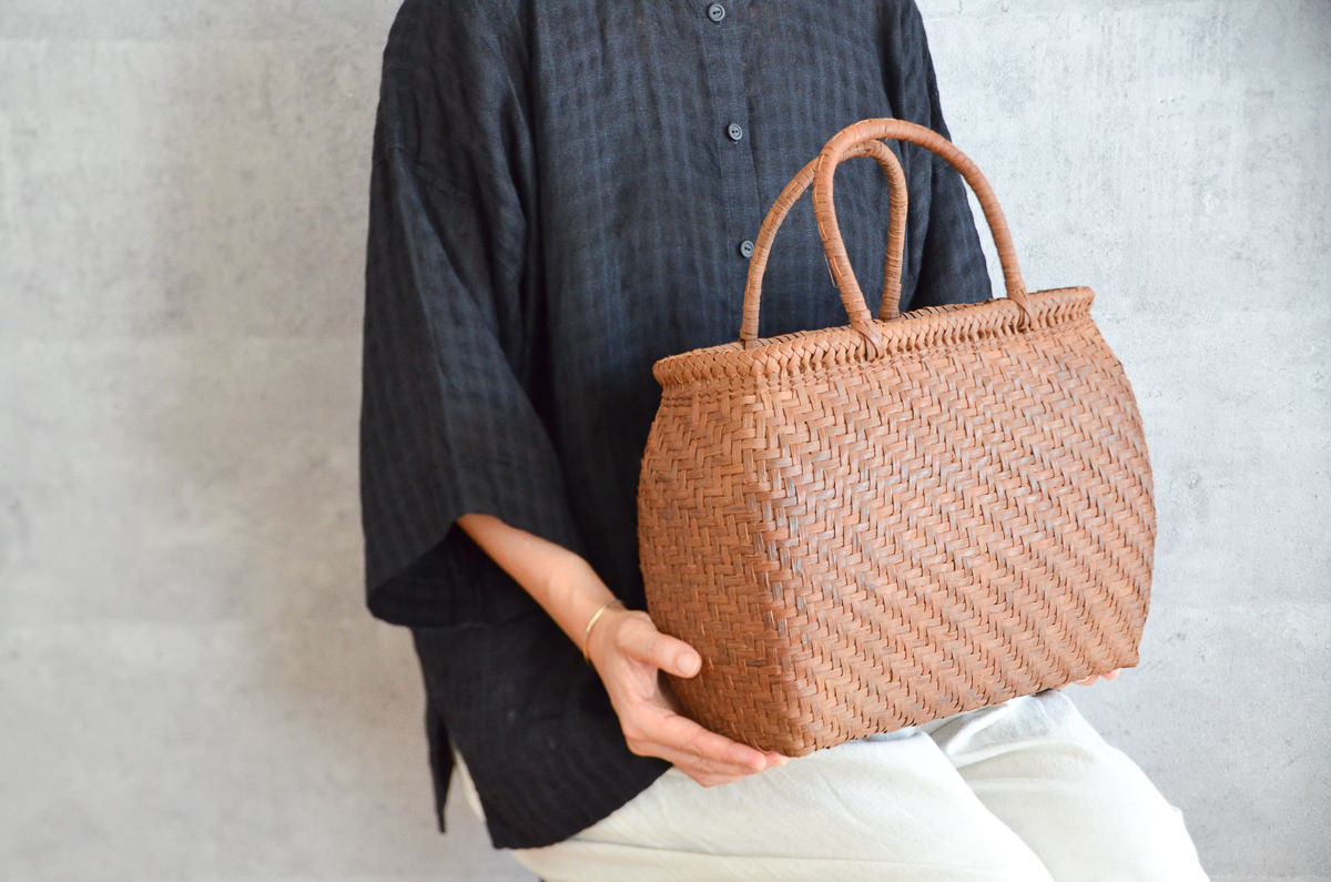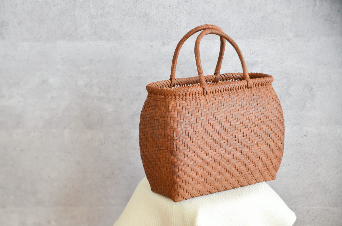 そのため、世代をこえるほど長いあいだにわたって使いつづけることができ、また使うたびにかごに触れることでその手の脂によって艶が増し、レザーのように樹皮表面の風合いが変わっていくのも魅力のひとつです。