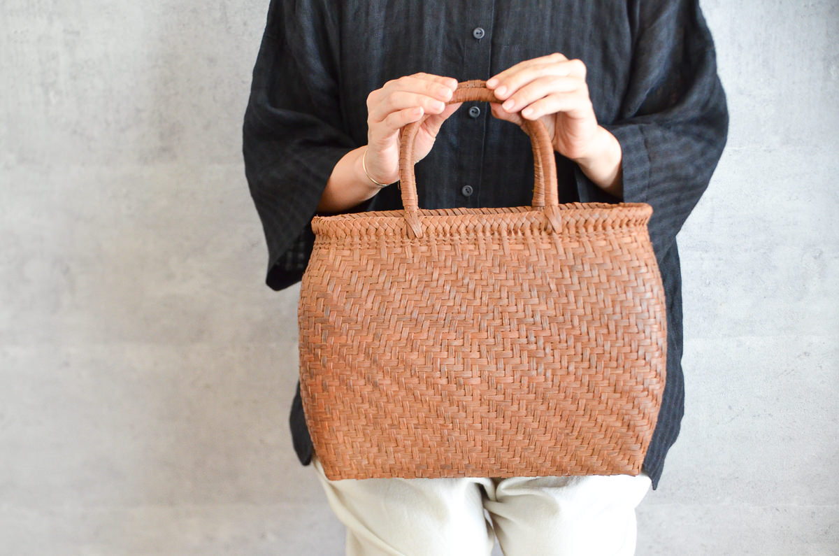 そのため、世代をこえるほど長いあいだにわたって使いつづけることができ、また使うたびにかごに触れることでその手の脂によって艶が増し、レザーのように樹皮表面の風合いが変わっていくのも魅力のひとつです。
