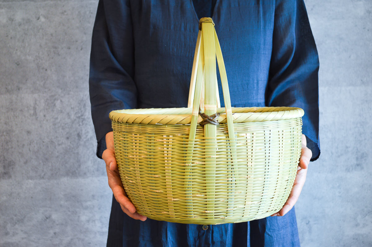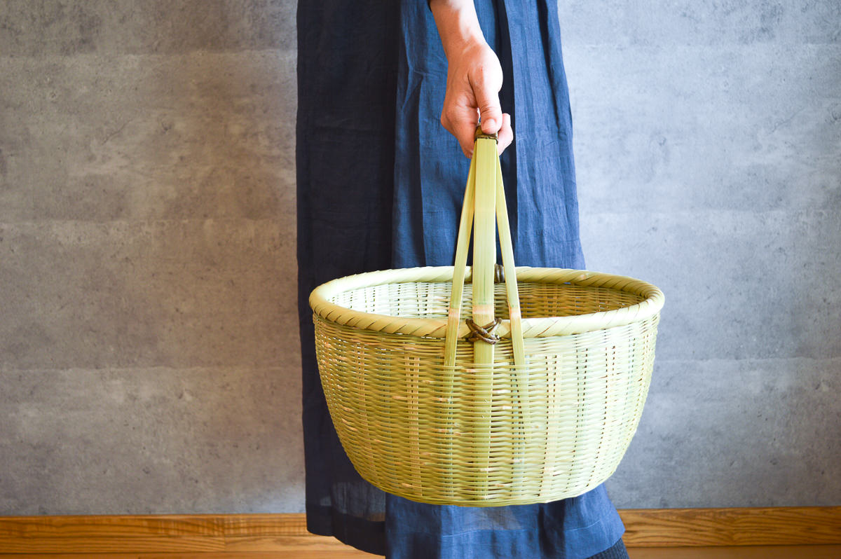 こちらは伐り出したままの青竹を使用して作られた、持ち手付きのかごです。