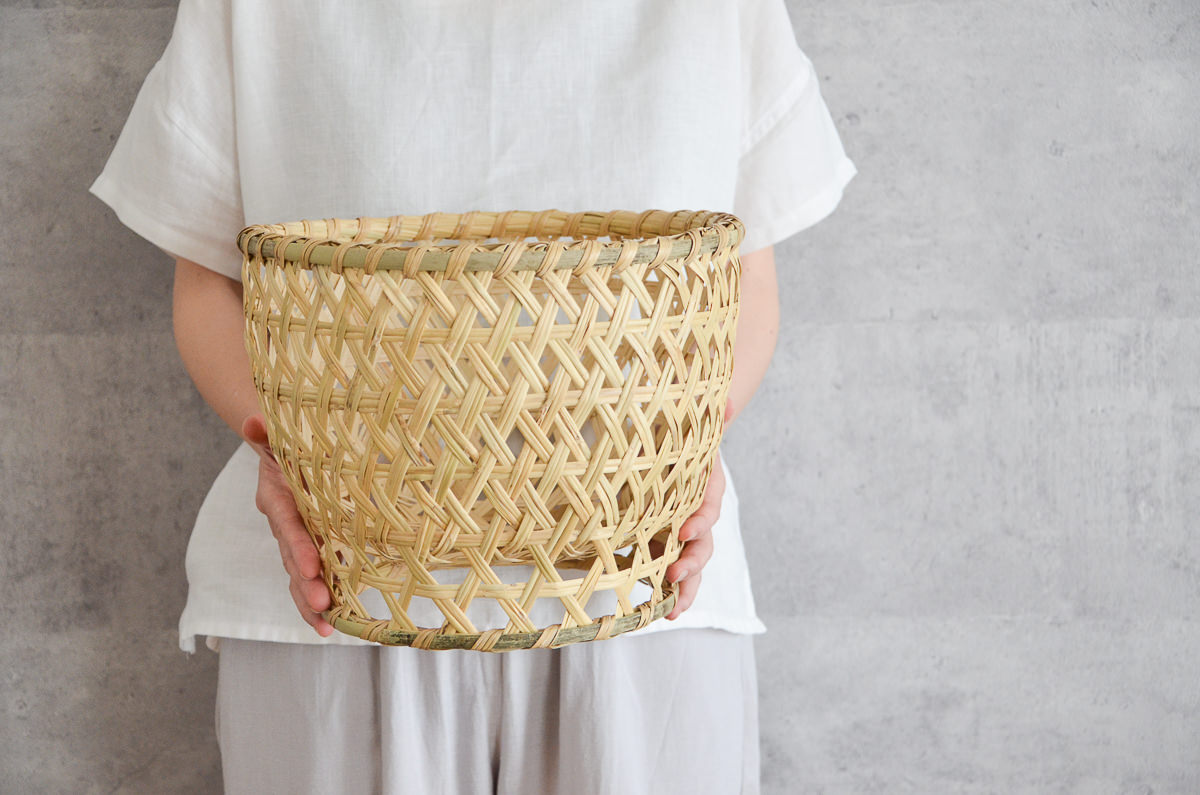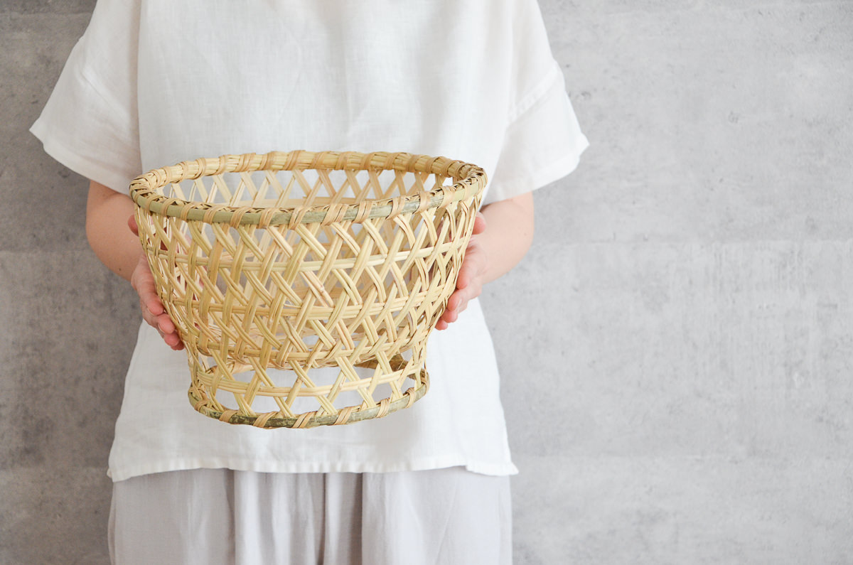 こちらのかごは、内側に竹ひごの皮ではなく繊維のある身の部分が使われており、