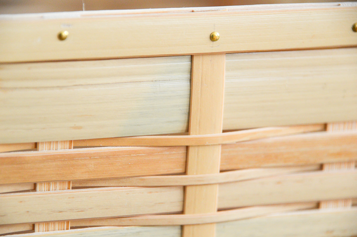 竹の油と色を抜いた「白竹」を使って作られた、ちりかごです。