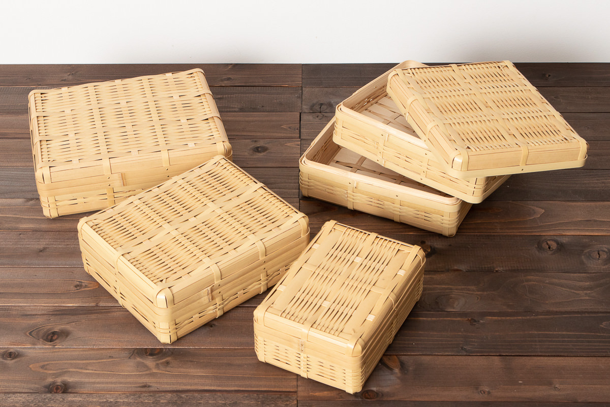 このような竹で作る四角いかごを総称して「角物(かくもの)」と呼びます。