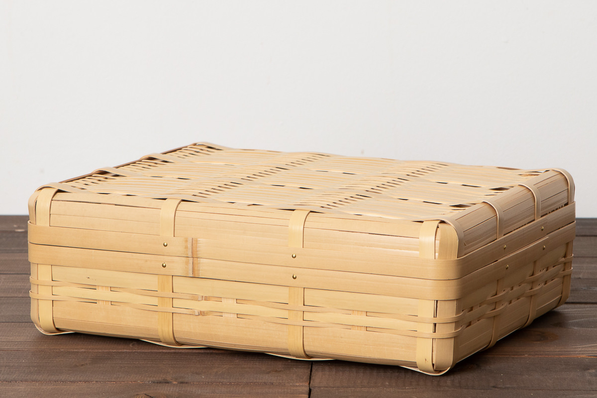 こちらの「大」サイズは、お客様のご要望をたくさんいただいたため、作っていただきました。別ページでご紹介している「三段手つき弁当かご」のかご部分寸法、横幅と奥行が同じです(高さは違います)。中サイズと同様に2人分ほどですが、こちらは大人2人が召し上がるのに、十分な量が詰められそうです。